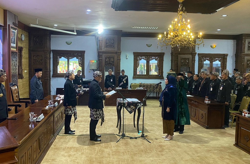 Batang - Bupati Batang M. Faiz Kurniawan melantik dan mengambil sumpah jabatan Penjabat Sekretaris Daerah (Pj Sekda) Kabupaten Batang Sri Purwaningsih di Aula Bupati, Selasa (8/4).